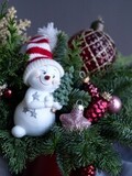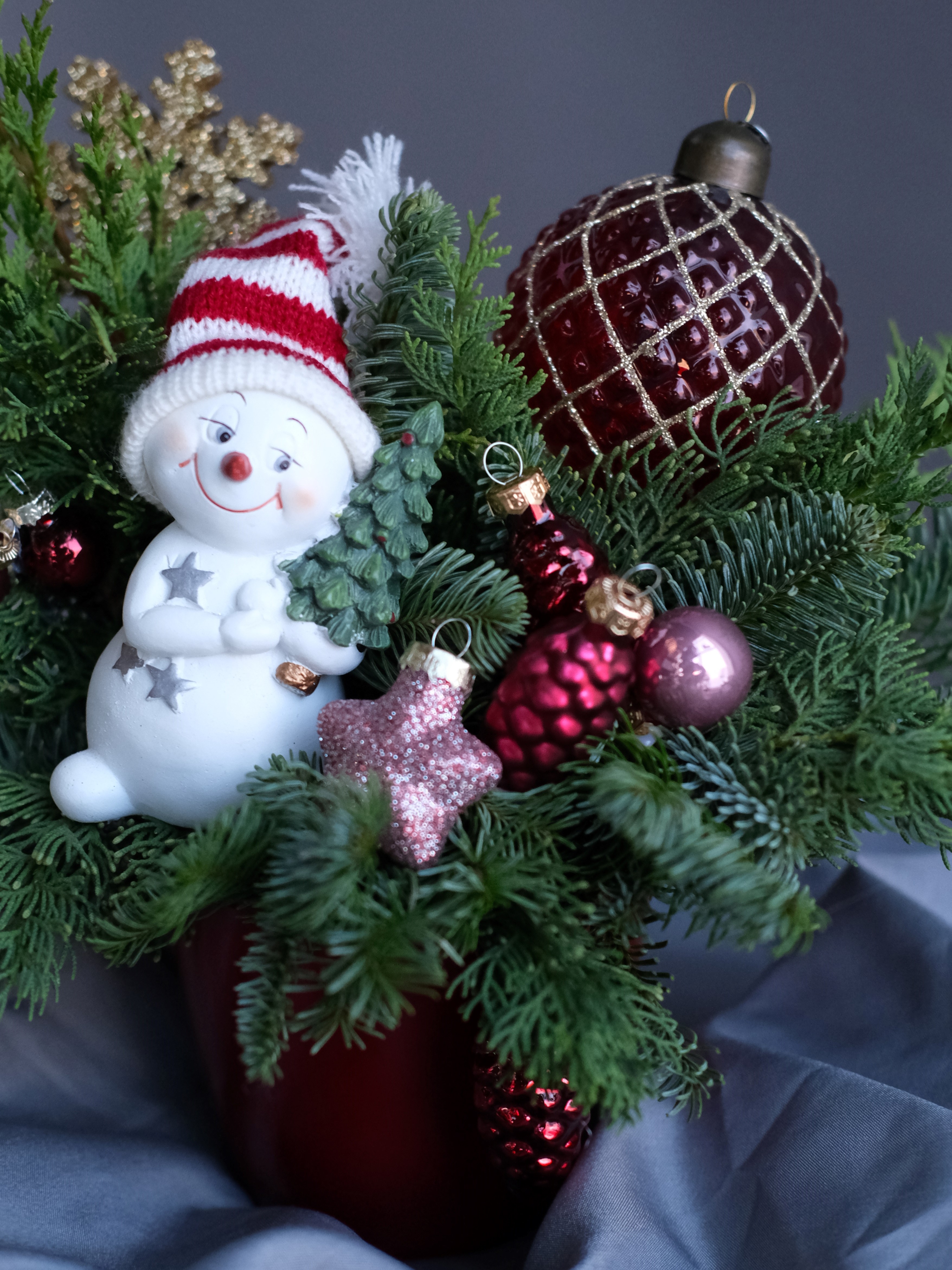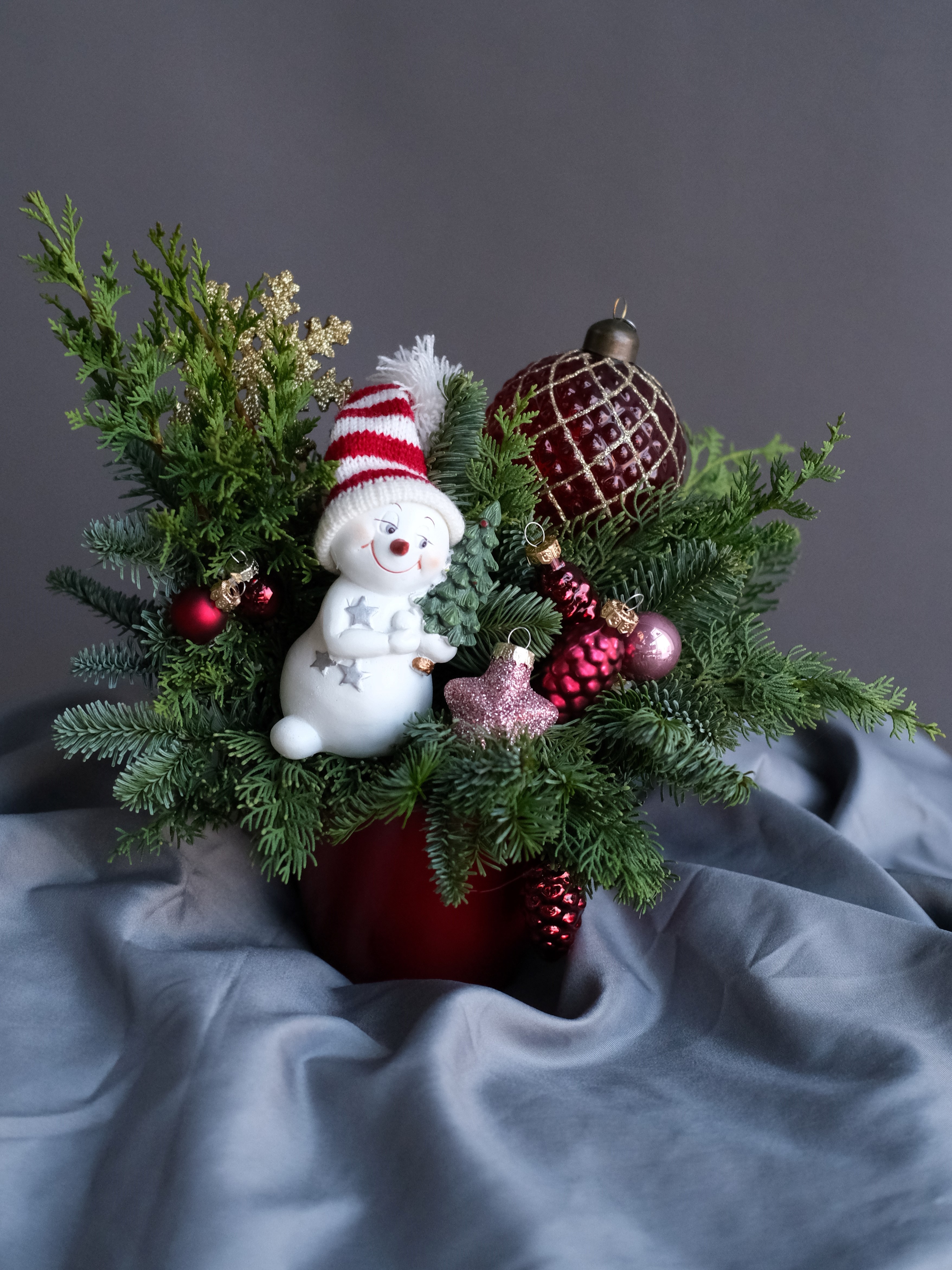 Новогодняя композиция в тёплой красной гамме, в центре которой — очаровательный снеговик, словно вышедший из праздничной сказки. Алые и бордовые оттенки создают атмосферу уюта, радости и торжества, напоминая о мерцании огней, подарках и зимних чудесах. Композиция наполняет пространство праздничным настроением и становится ярким акцентом новогоднего декора.