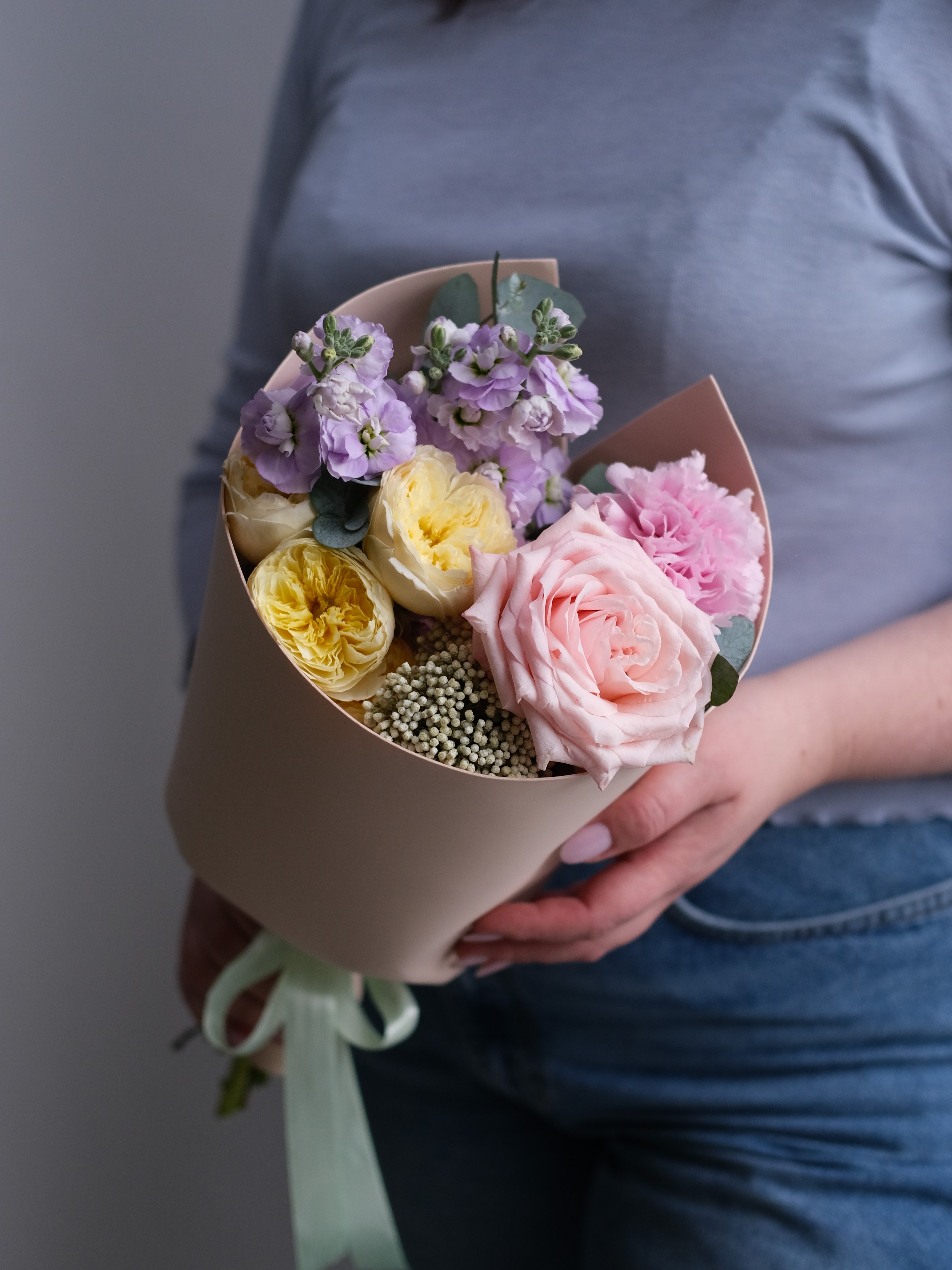 Как будто написан легкими мазками кисти — этот букет словно сошел с акварельного полотна.