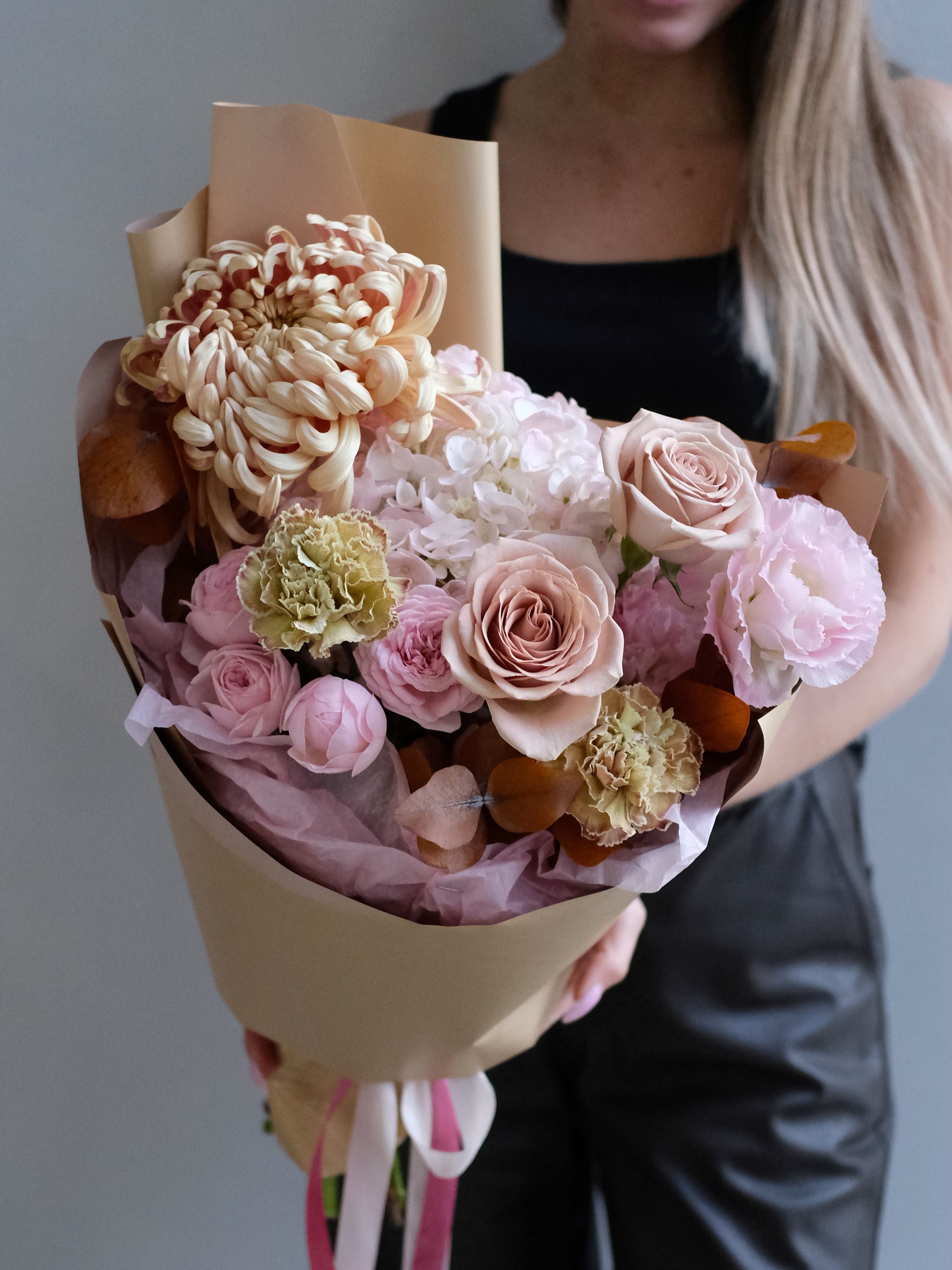 Объятие из цветов — именно так можно назвать этот букет. Мягкие линии, живые краски, ощущение тепла и уюта, которое хочется забрать домой. Это не просто подарок, а маленький кусочек душевного комфорта.