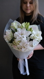 Этот букет — как обещание счастья. Нежный, но уверенный, он несёт в себе тепло и заботу. С ним каждый день становится ярче, а праздник — душевнее.
