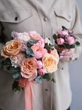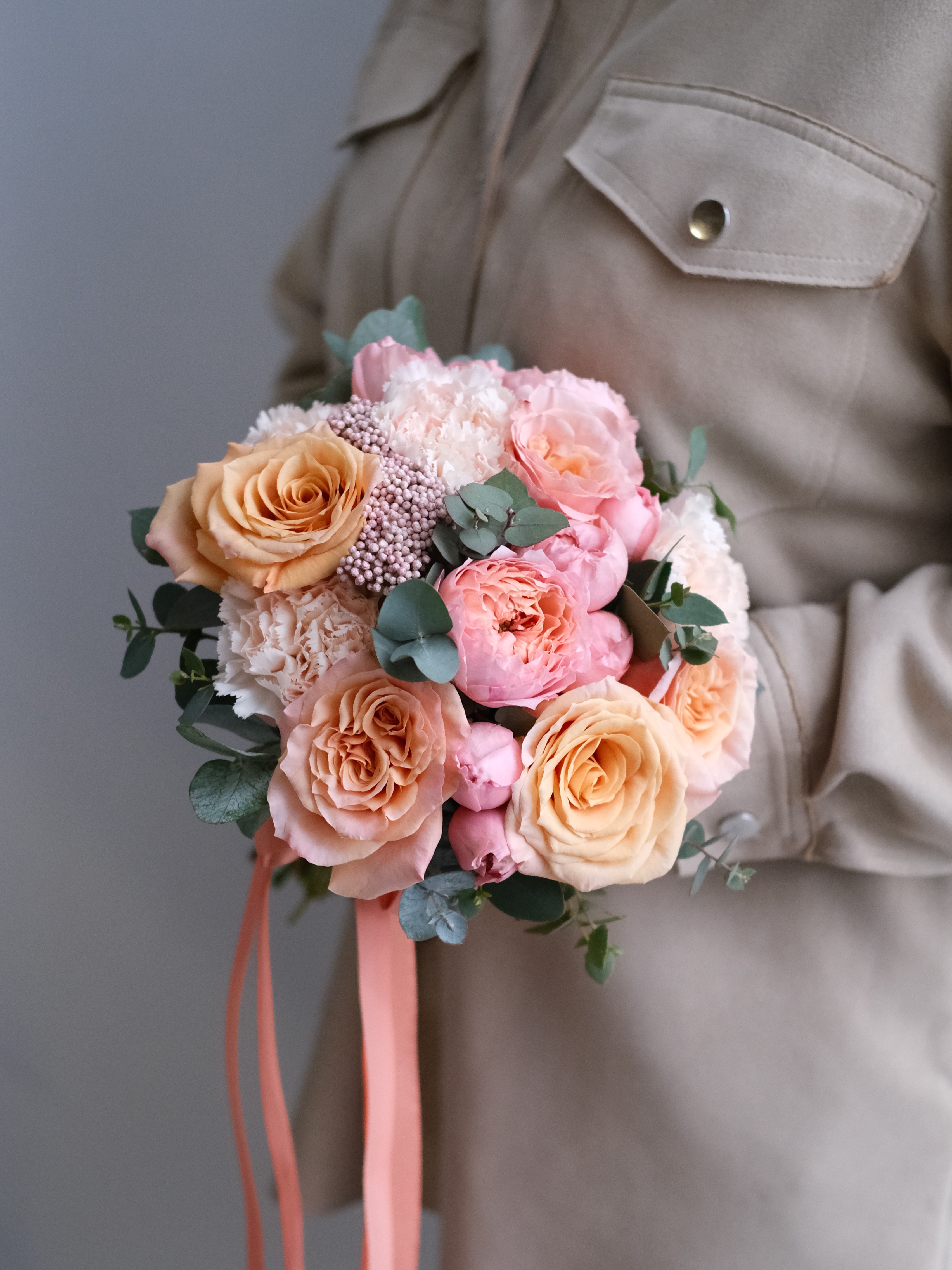 Нежный букет невесты в персиковых оттенках — воплощение утончённости и природной гармонии. Тёплые персиковые, кремовые и сливочные тона создают ощущение лёгкости, свежести и романтики. Композиция из роз, пионов и веточек эвкалипта подчёркивает естественную красоту невесты и прекрасно дополняет свадебный образ в пастельной палитре.