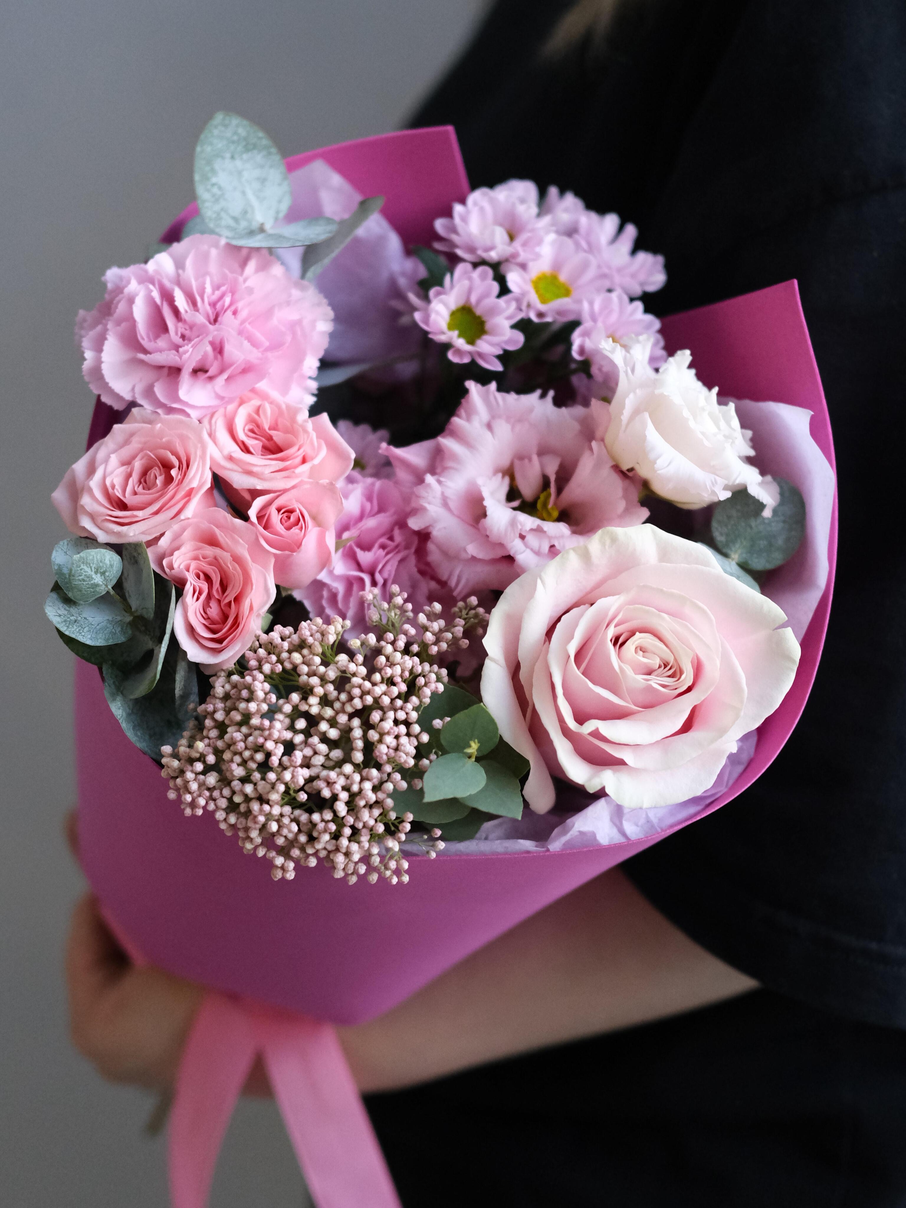 Этот букет — как обещание счастья. Нежный, но уверенный, он несёт в себе тепло и заботу. С ним каждый день становится ярче, а праздник — душевнее.