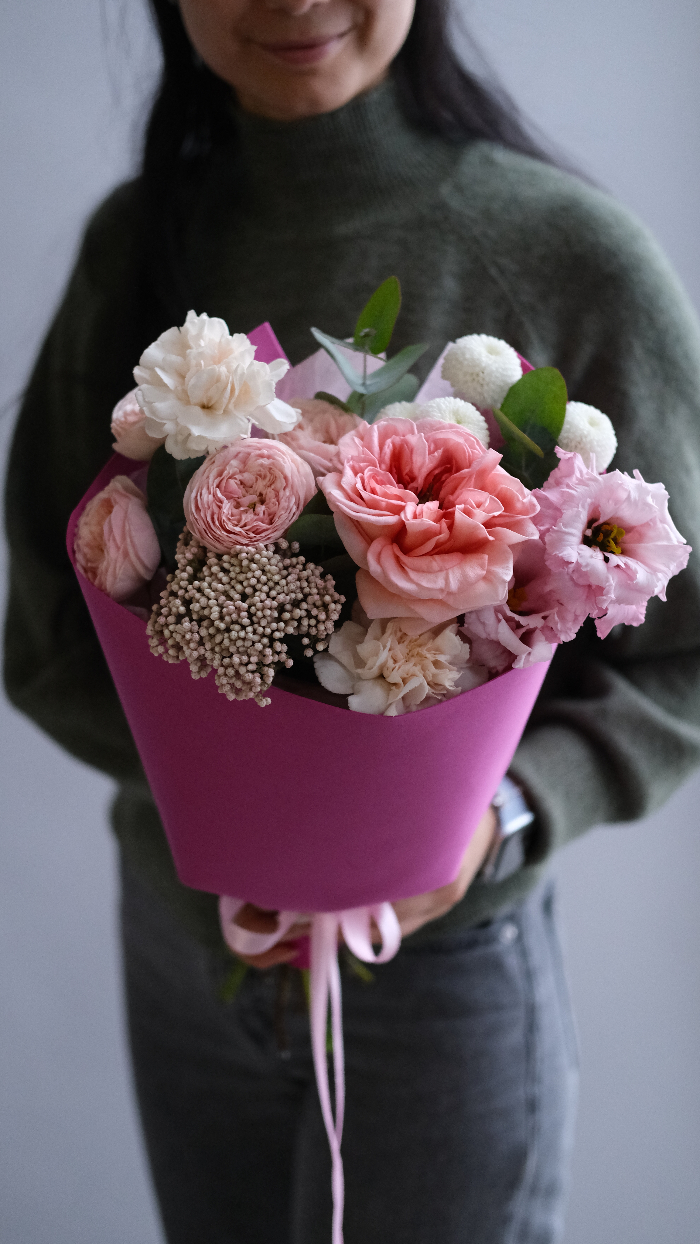 Объятие из цветов — именно так можно назвать этот букет. Мягкие линии, живые краски, ощущение тепла и уюта, которое хочется забрать домой. Это не просто подарок, а маленький кусочек душевного комфорта.