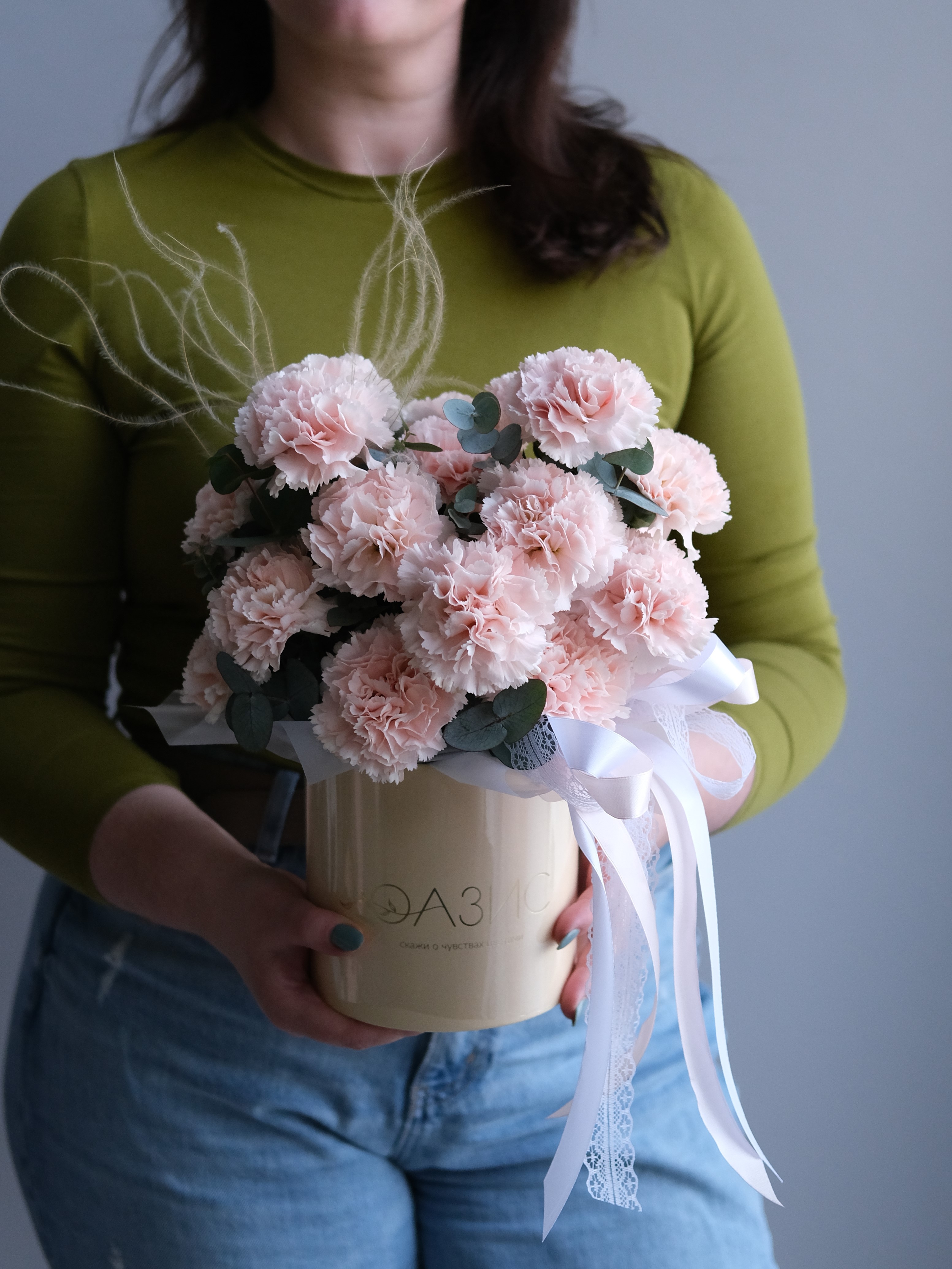 Мягкие, бархатистые лепестки диантусов задают настроение уюта, а невесомая стифа добавляет композиции воздуха и свободы. Она не перегружает, а наоборот — оставляет пространство для эмоций.