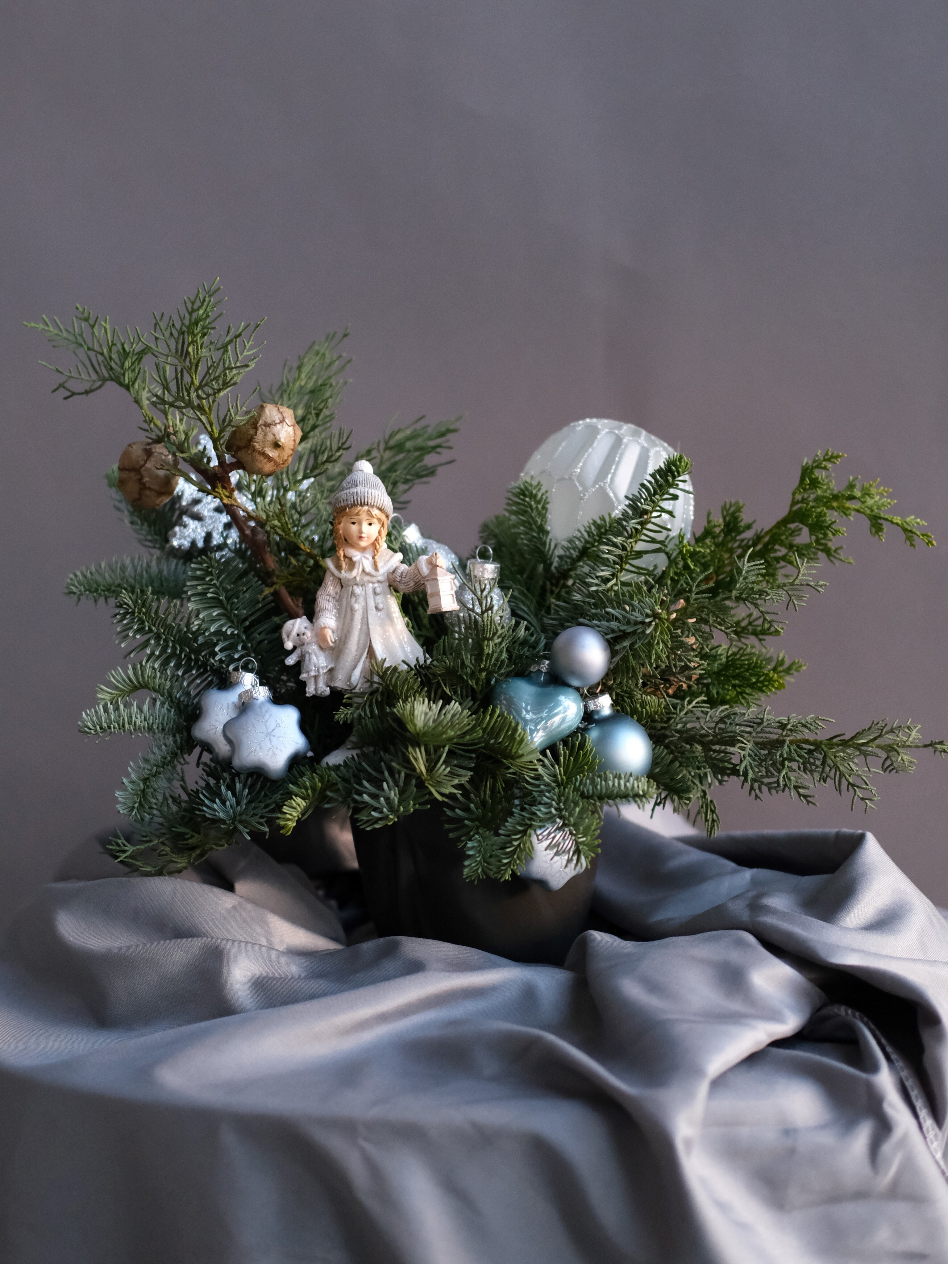 Композиция в холодной зимней палитре: серебристые акценты, голубые ноты и мягкая хвоя. Девочка с фонарём добавляет истории — будто освещает дорогу к чудесам. Очень атмосферная и нежная.