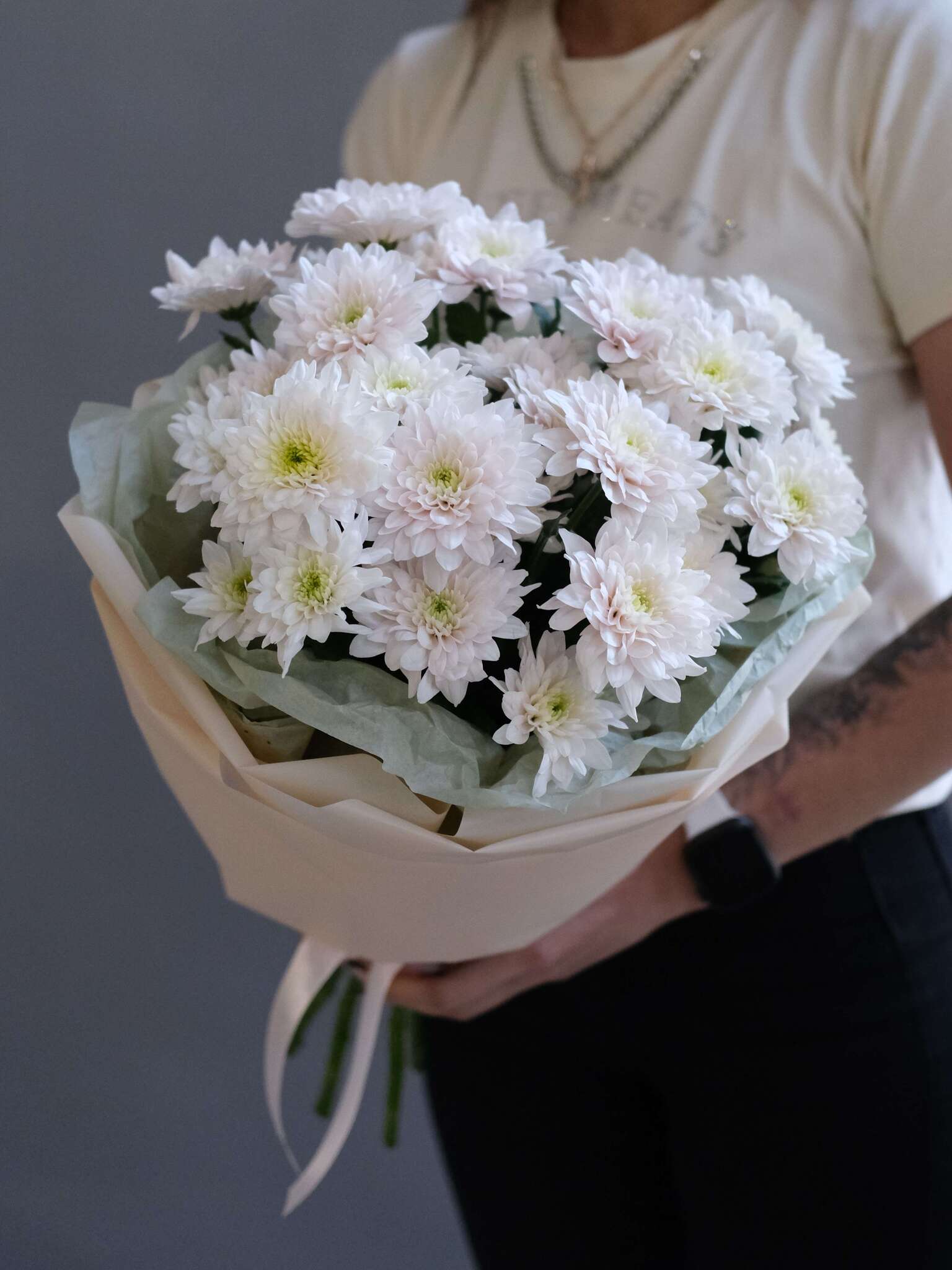 Этот букет — как обещание счастья. Нежный, но уверенный, он несёт в себе тепло и заботу. С ним каждый день становится ярче, а праздник — душевнее.