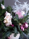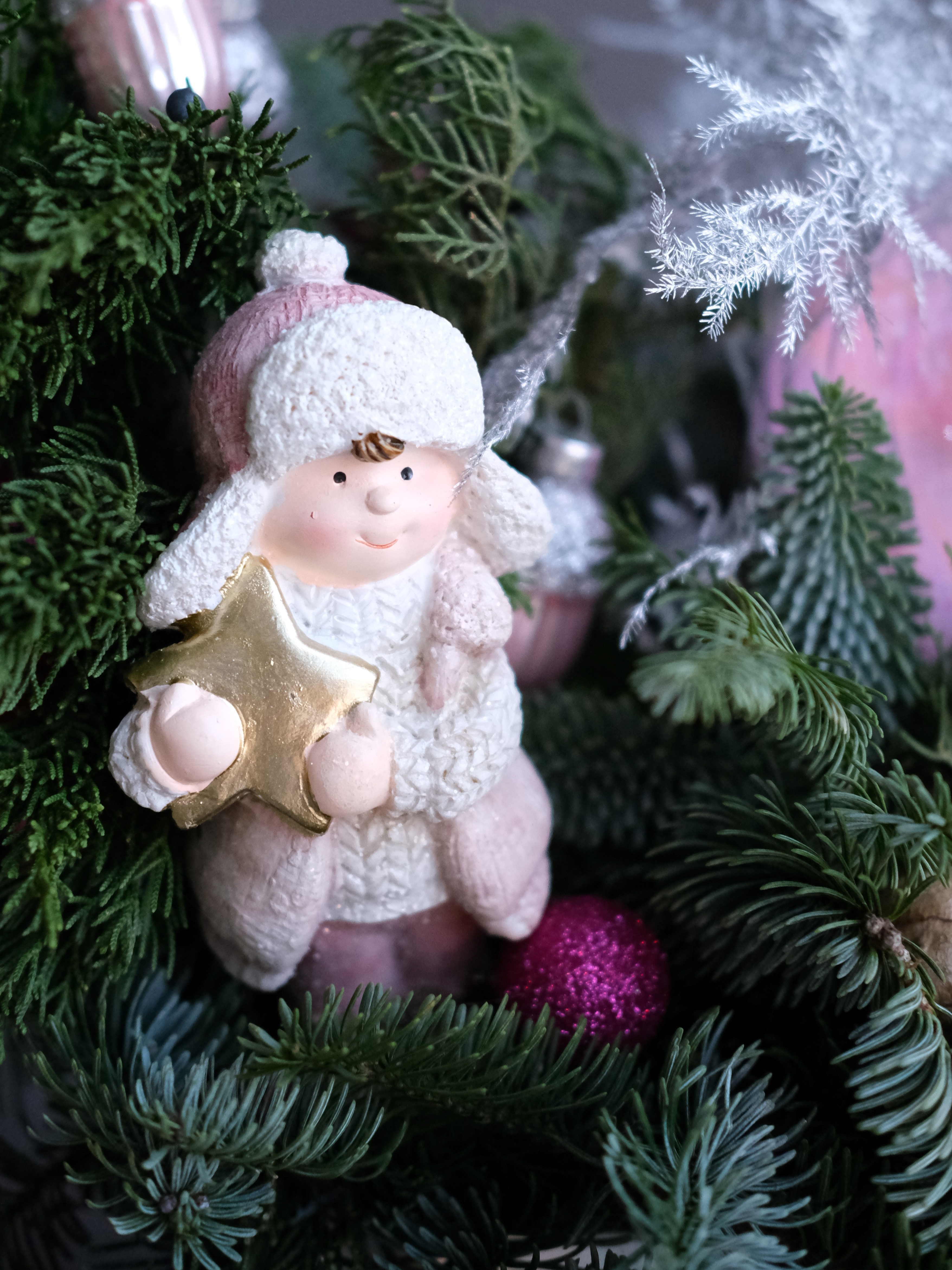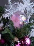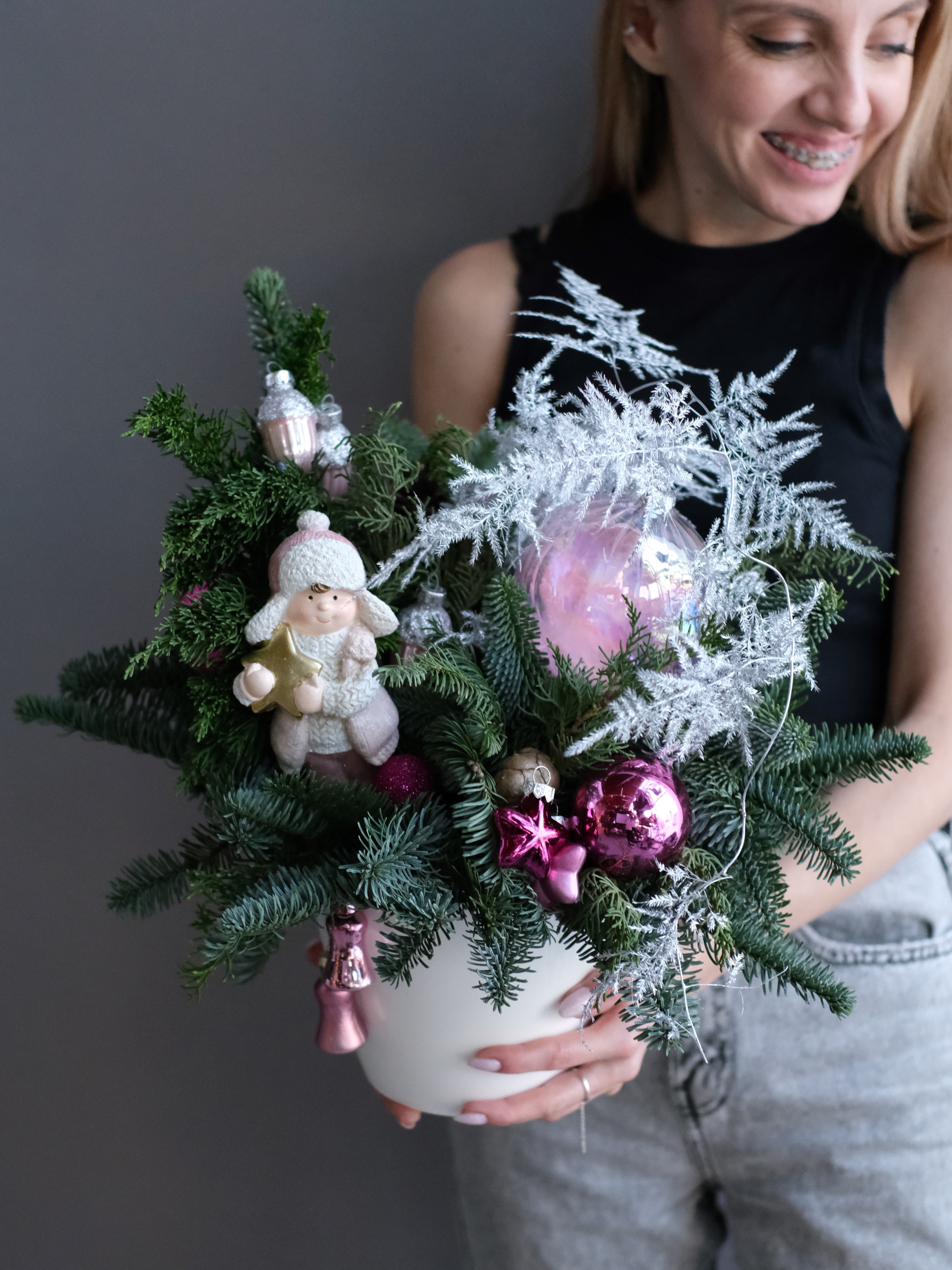 Новогодняя композиция в нежных розовых тонах с серебряными акцентами, создающими эффект праздничного блеска. Сочетание мягкости розового и холодного сияния серебра дарит ощущение лёгкости, уюта и волшебства. Идеальна для декора интерьера, витрин и подарочного оформления, добавляя празднику изысканность и нежность.