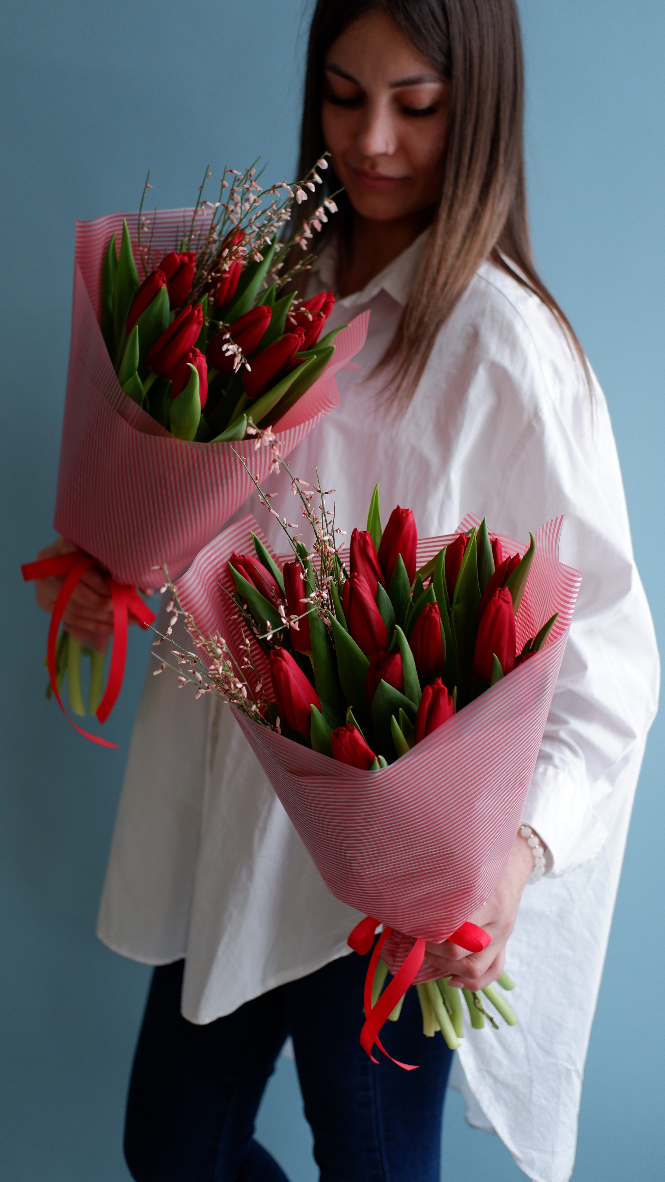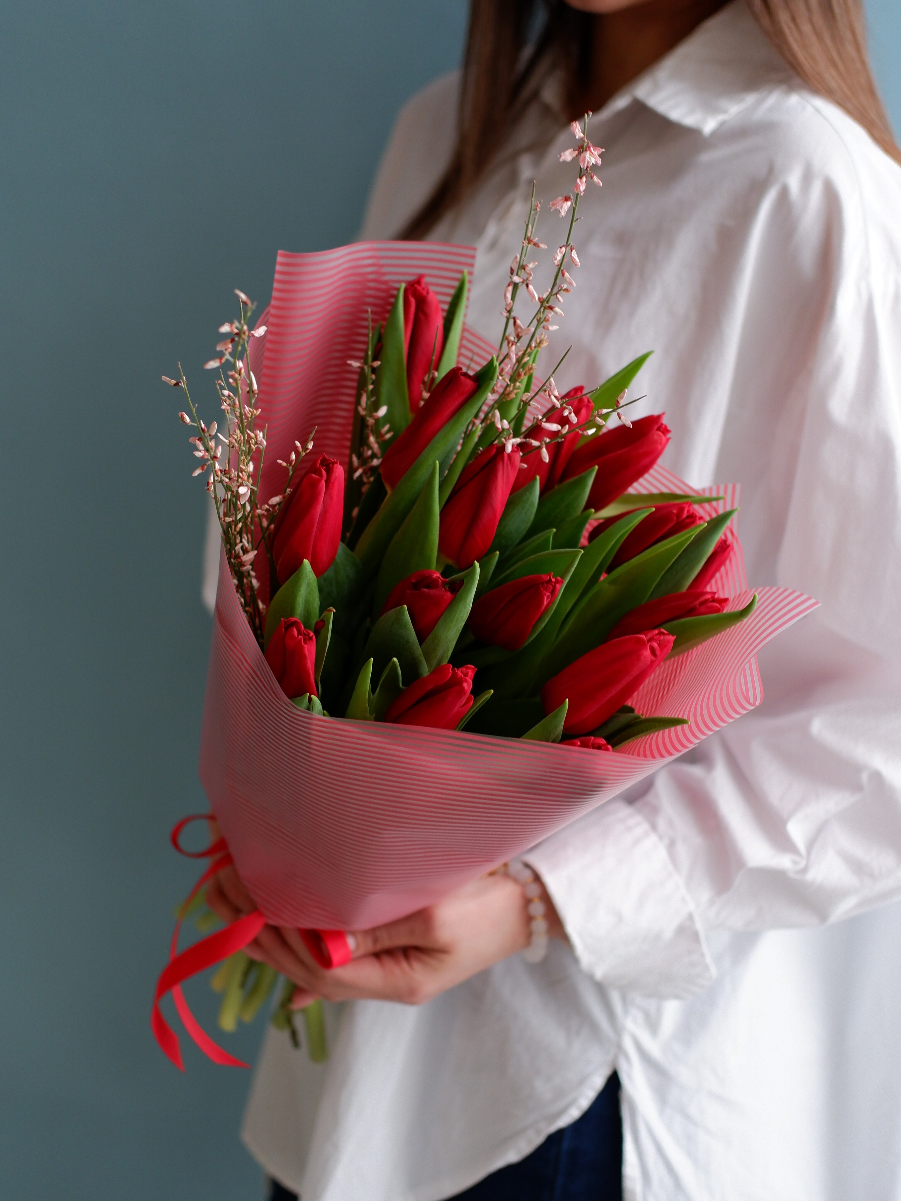 Воздушный дуэт весны: утончённые тюльпаны и лёгкая гениста создают ощущение движения и свежести. Такой букет пахнет вдохновением и первым тёплым ветром.