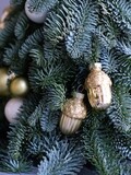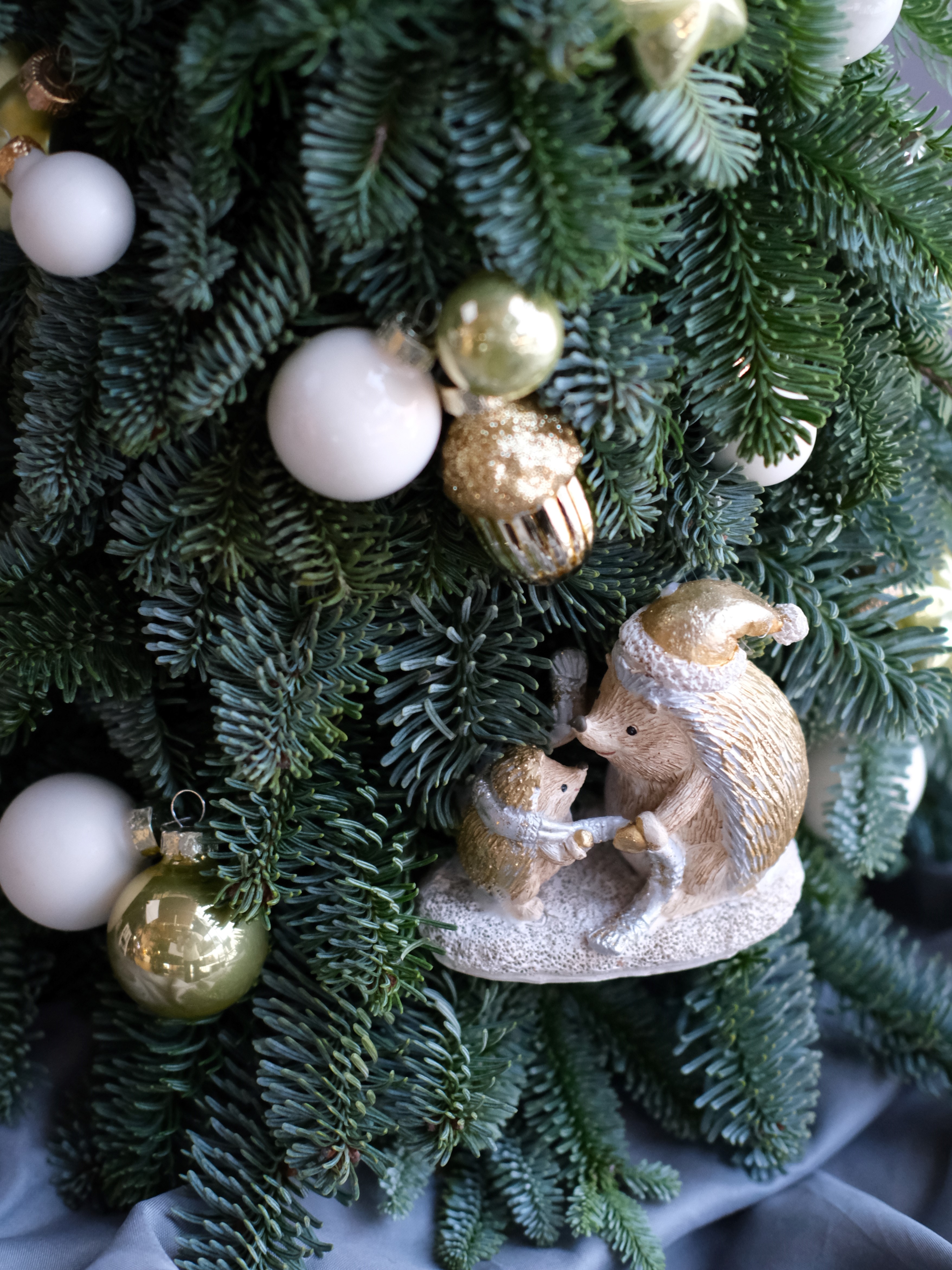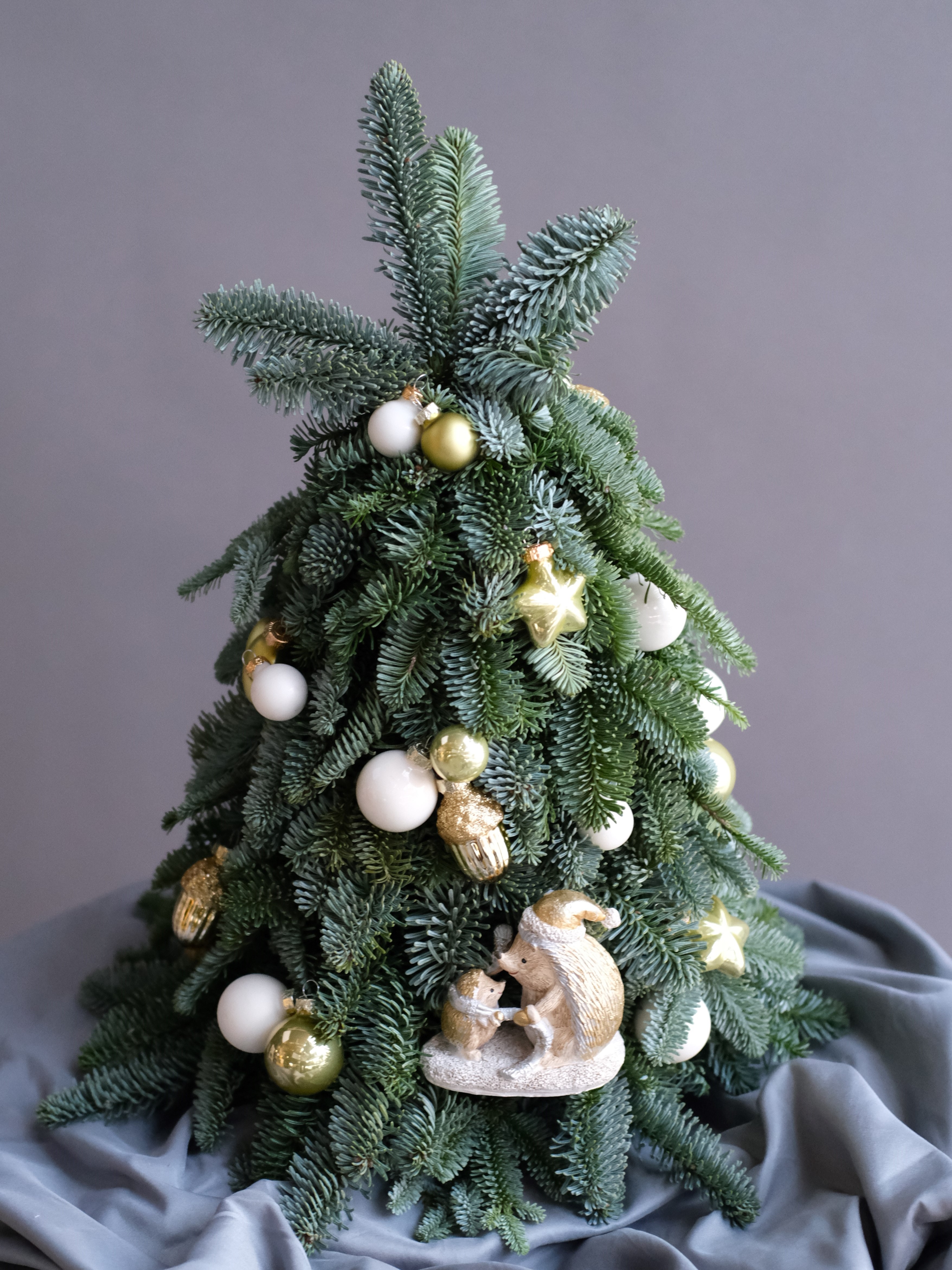 Новогодняя композиция в форме ёлочки, выполненная в тёплых золотых оттенках и дополненная фигуркой очаровательного ёжика. Благородный блеск золота создаёт атмосферу уюта и праздника, а сказочный персонаж добавляет композиции душевности и новогоднего настроения. Подходит для интерьерного декора, витрин и подарочного оформления.