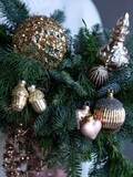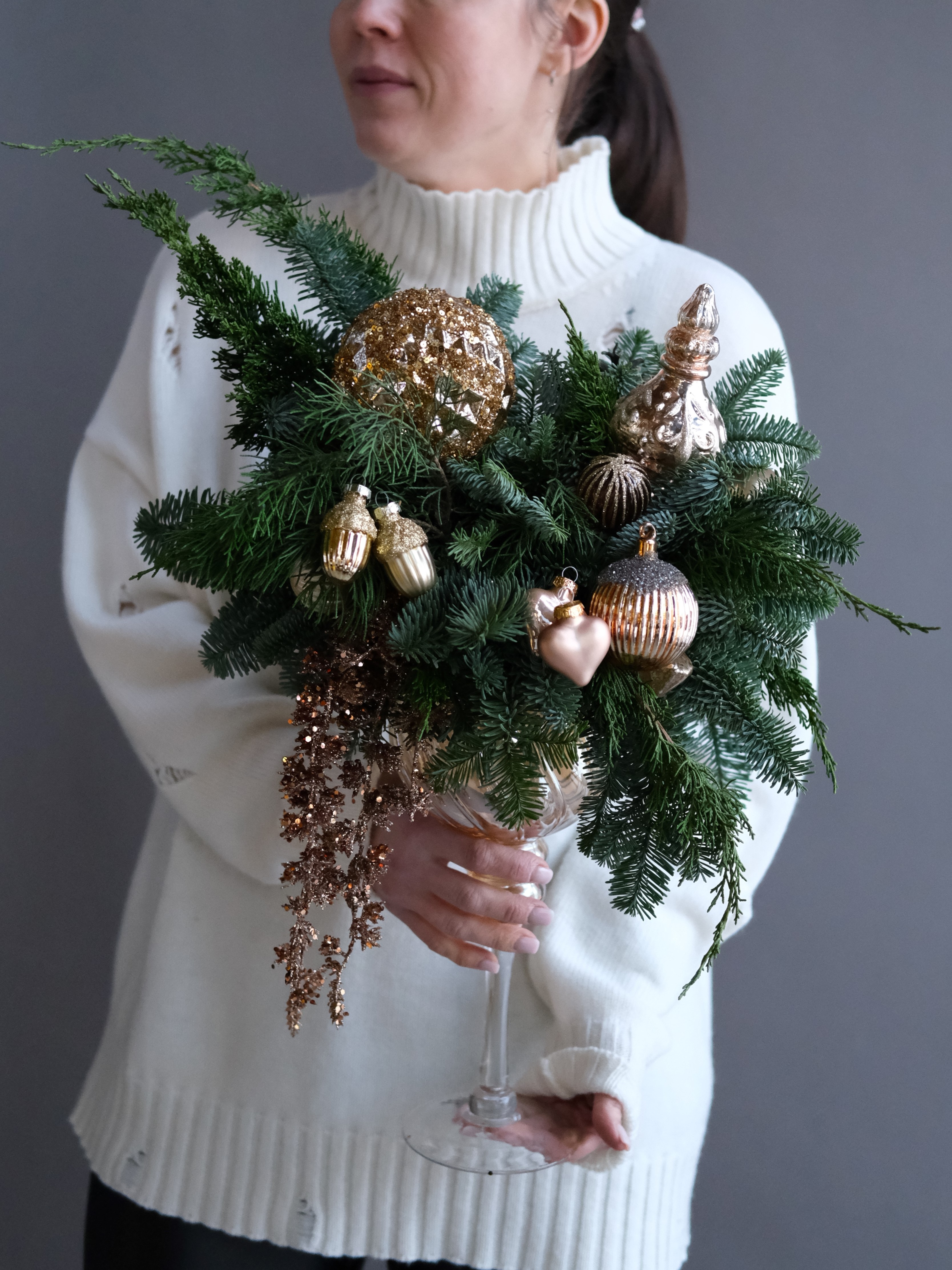 Композиция из хвои в бокале с золотыми акцентами, словно маленький зимний лес, наполненный праздничным сиянием. Создаёт атмосферу уюта и волшебства, идеально подходит для украшения интерьера и праздничного стола.